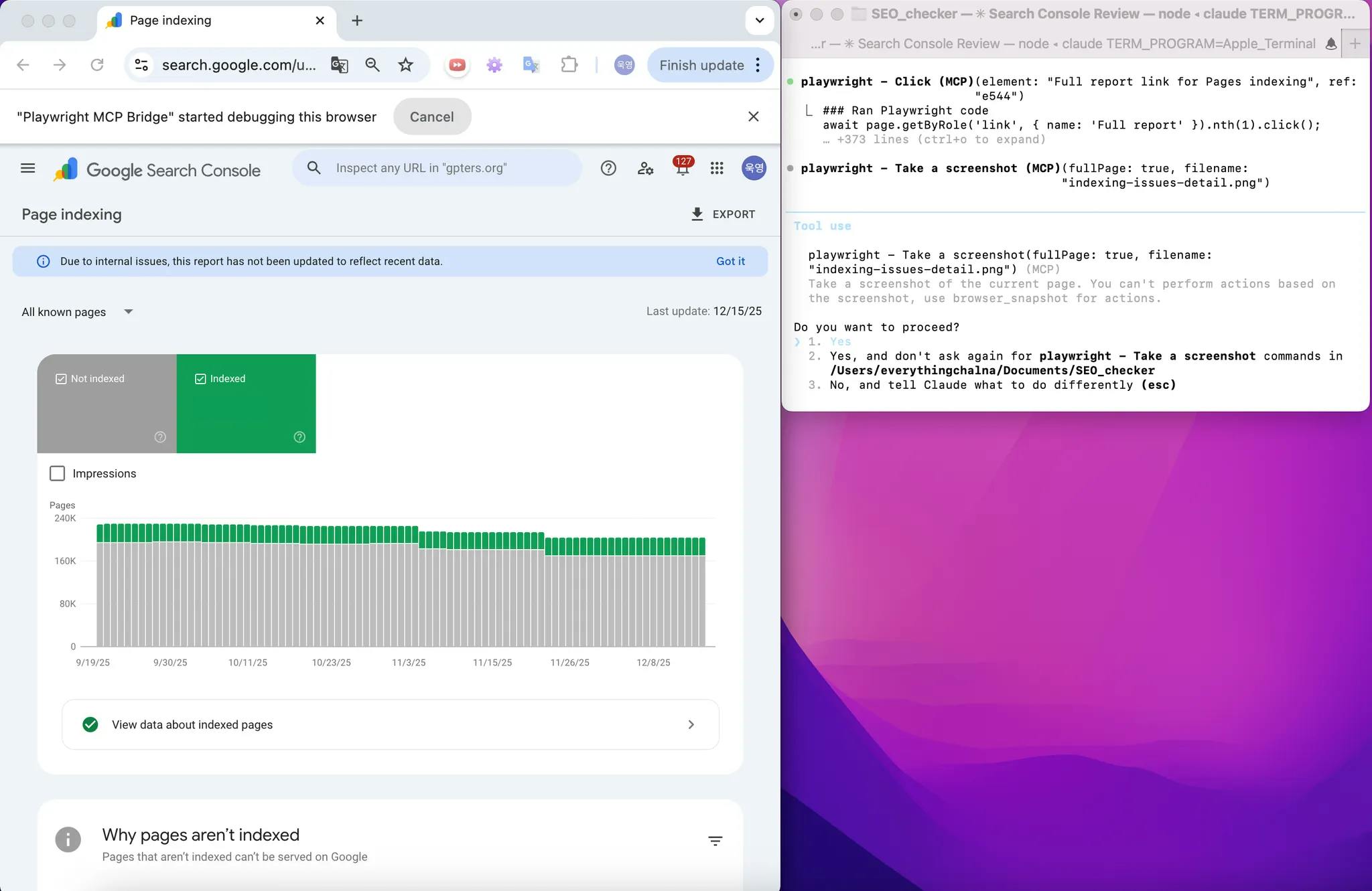 이를 Allow하면 ClaudeCode가 구글 서치 콘솔을 돌아다니면서, 현재 구글 서치 콘솔에 어떤 문제가 있는지 확인해줍니다.
