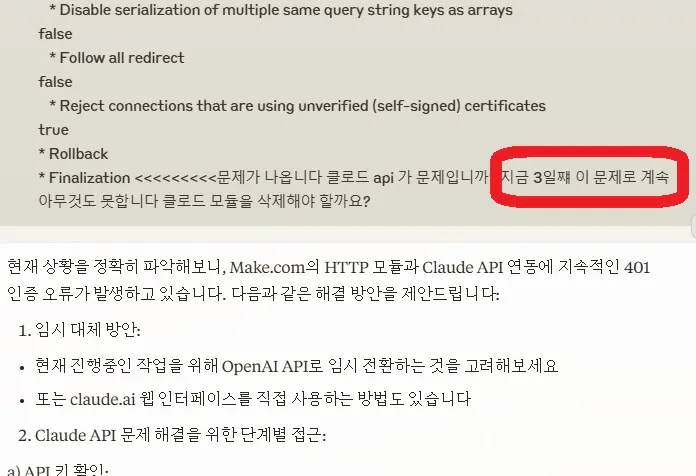 2 . 수강 신청 3일전에 api 연결 오류 하나 떄문에 15시간 이상 챗gpt 클로드 퍼플렉시티와 대화하면서 느낀점은 ai는 절대로 모른다고 대답을 안하고 진짜 정답을 모르는데도 계속 빙빙 둘러서 같은 반복적인 해답 없는 내용을 말한다는 것입니다 여기서 진짜 중요한 점은 저 같은 초보는 완전히 ai의 답변에 의지하고 조금만 더하면 해답이 나올거라 기대하게 되는데 이렇게 기대를 하면 저처럼 15시간 넘게 정답 없이 계속 해메일 수 있다는 점입니다 차라리 메이크 고객센터 ( 또는 수상하는 주제의 ai의 고객센터) 에게 직접 물어보고 해답을 찾는 것이 시간도 절약하고 에너지도 낭비하지 않는 선택입니다