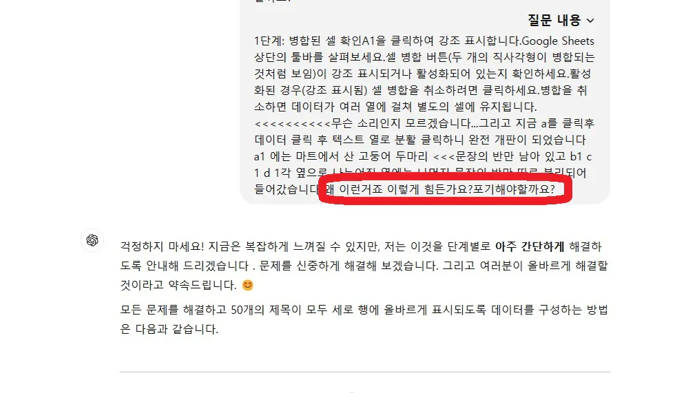 우선 첫 모듈의 구글 시트에 제목 부터 내 주제에 맞는 제목으로 교체 해야 했기에 생전 처음 보는 구글 시트에 퍼플렉시티에서 생성한 제목 50개를 a의 행렬 50개에 넣는 것 조차 제대로 작동이 안되었습니다 3시간 가까이 대화하다가 다시 챗gpt 와 3시간 넘게 대화해도 결국 제목 50개를 구글 시트에 넣는 것을 실행하지 못하였는데요 구글 시트를 처음 접하게 된 저로써는 진짜 너무 어렵고 너무 힘들게만 느껴지네요