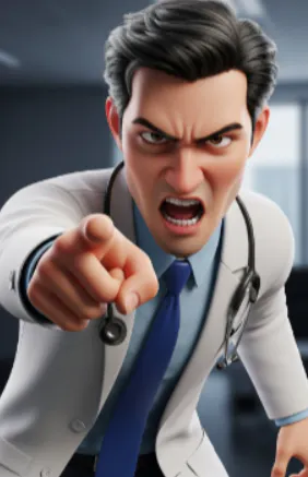 닥터 능이라는 이름의 남자 의사 캐릭터의 영화 같은 3D 애니메이션 스타일 클로즈업 샷을 만들어줘.  그는 카메라 쪽으로 몸을 기울이며 시청자를 향해 공격적으로 검지 손가락을 가리키고 있어(제4의 벽을 깸). 표정은 시니컬하고 강렬하며, 마치 경고를 하듯 소리치며 입을 벌리고 있어. 배경은 흐릿한 현대적인 사무실이고, 전문적인 스튜디오 조명이 그의 얼굴과 손을 비추고 있어.