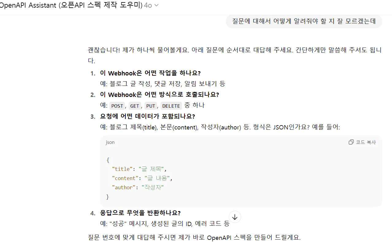 수업시간에 해 보았던 블로그 글쓰기 자동화를 다시 한 번 해보고, 오픈 API만들기를 시도해 보았다. 수업시간에는 박카스님이 주신 스키마를 사용해서 나만의 스타일에 맞는 스크마를 만들어 보고 싶었다.