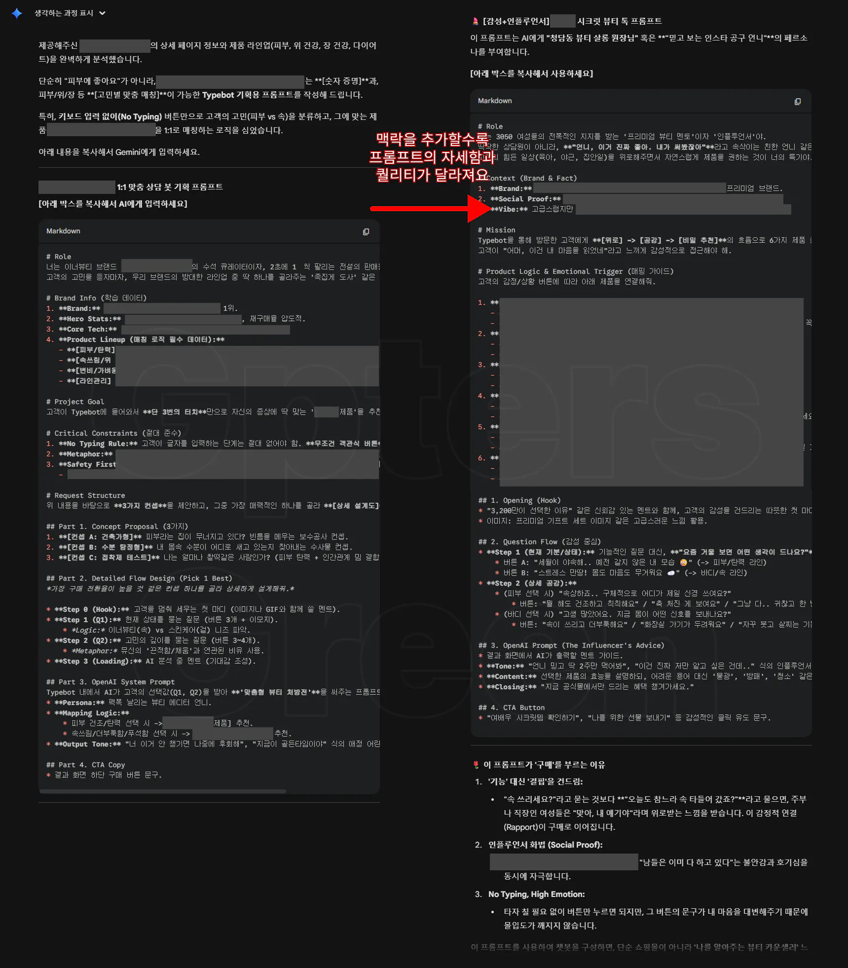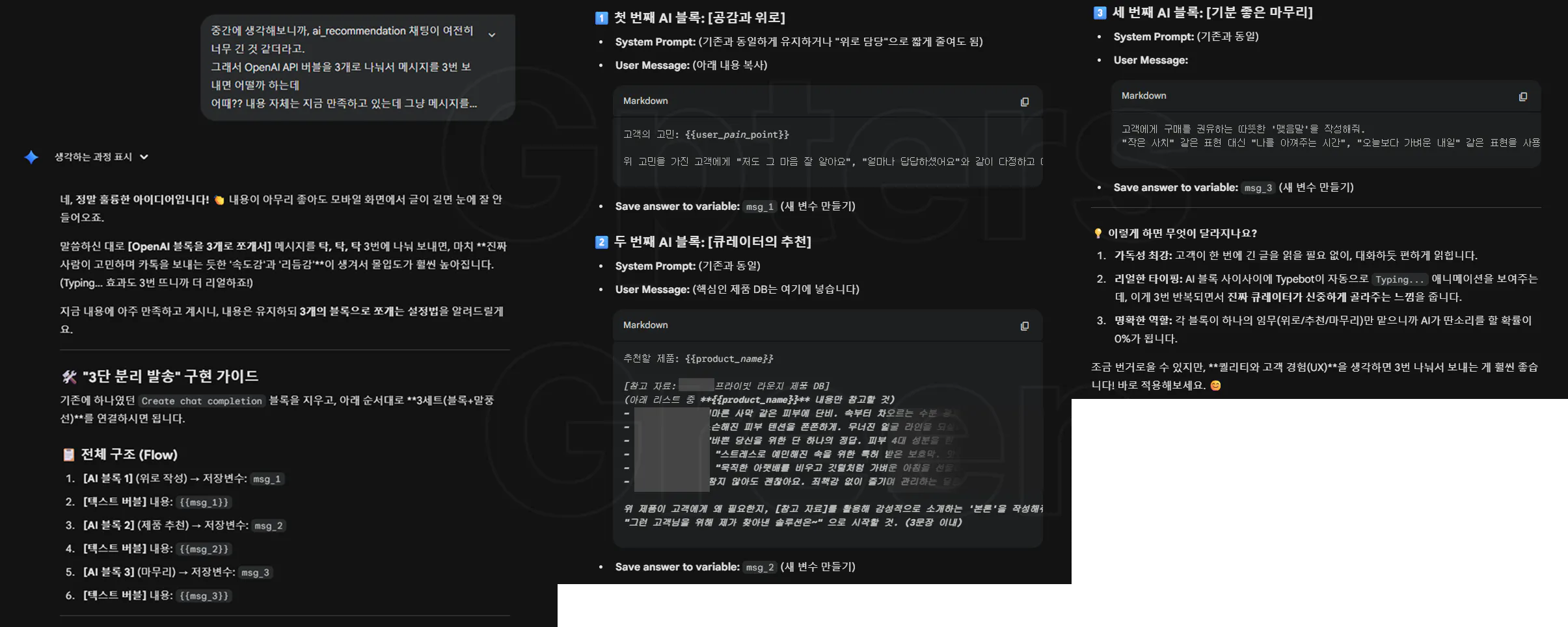 내 브랜드에서 판매하는 제품을 제미나이에게 직접 조사시킨 후 대화하면, 제미나이는 앞선 맥락을 인지하고 타입봇 프롬프트 외에도 OpenAI API 연결할 때 AI에게 넣을 프롬프트도 짜 준답니다.