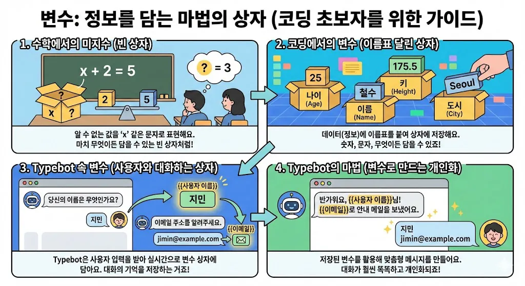 심지어 여기서의 𝓍(빈 상자)는 숫자뿐만 아니라 글자, 날짜, 예/아니오, 메일 주소... 등등 세상의 모든 정보를 담을 수 있게 됩니다. 정보를 담을 수 있는 상자들을 두고, 𝓍같은 어려운 이름 대신 우리가 알아보기 쉬운 이름표를 상자에 붙이는 거죠.