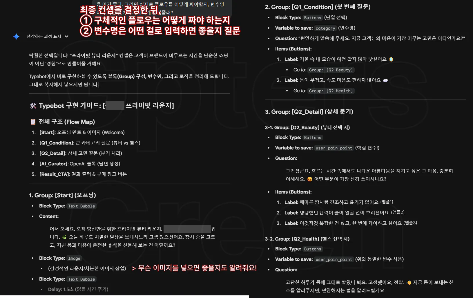 2️⃣Gemini에게 Typebot 컨셉 도출용 스크립트를 넣고, 컨셉 확정 & 구체적인 플로우 짜기