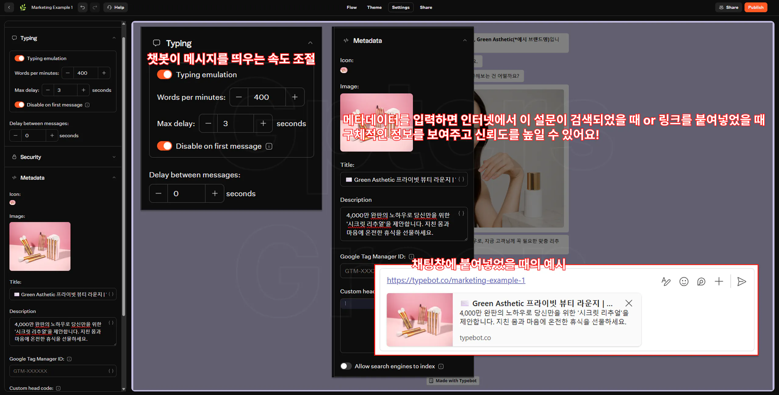 세팅 창에서는 챗봇이 메시지를 보내는 속도를 조절해서 실제로 대화하는 듯한 느낌을 연출할 수도 있어요. 또, 메타데이터도 넣어주면 인터넷에서 이 설문(챗봇)이 검색되었을 때나, 링크를 붙여넣기 했을 때 미리보기에서 구체적인 정보가 보이기 때문에 신뢰도를 높일 수 있답니다.
