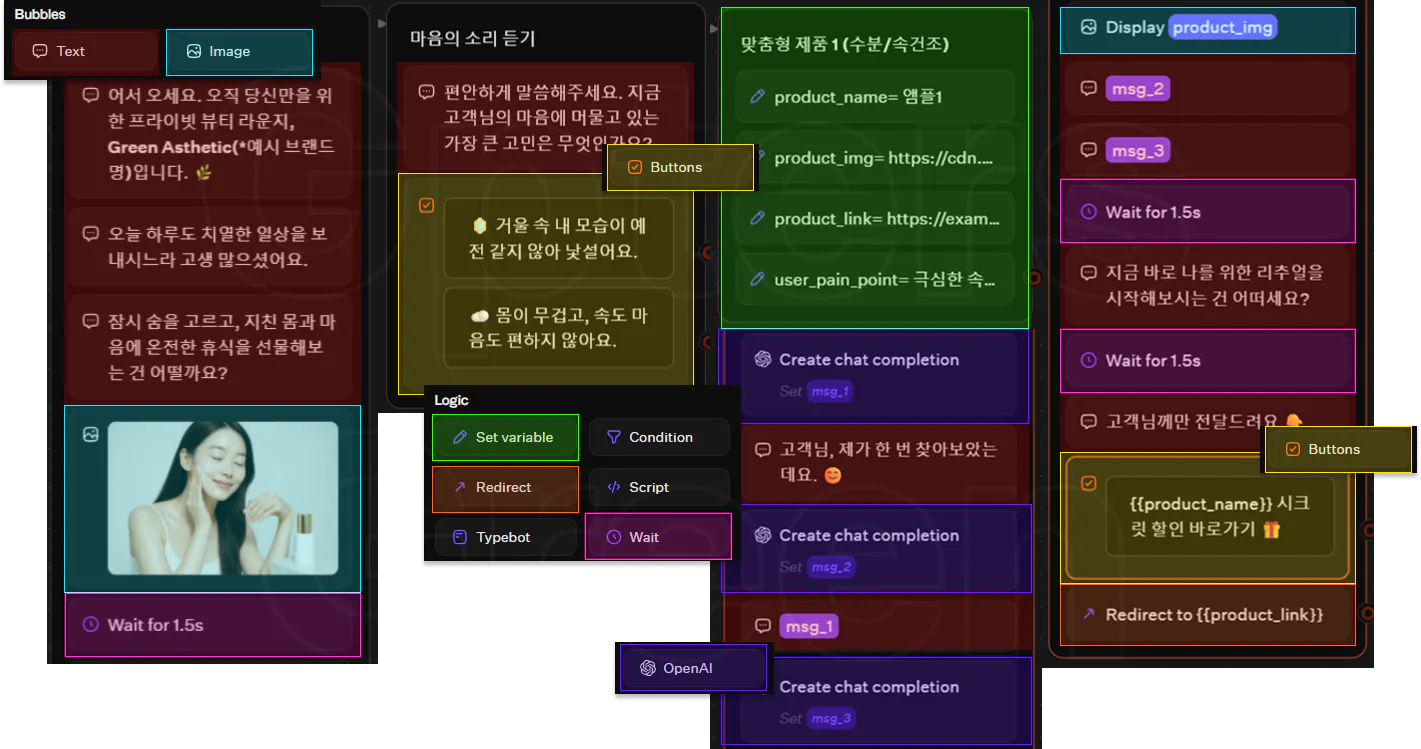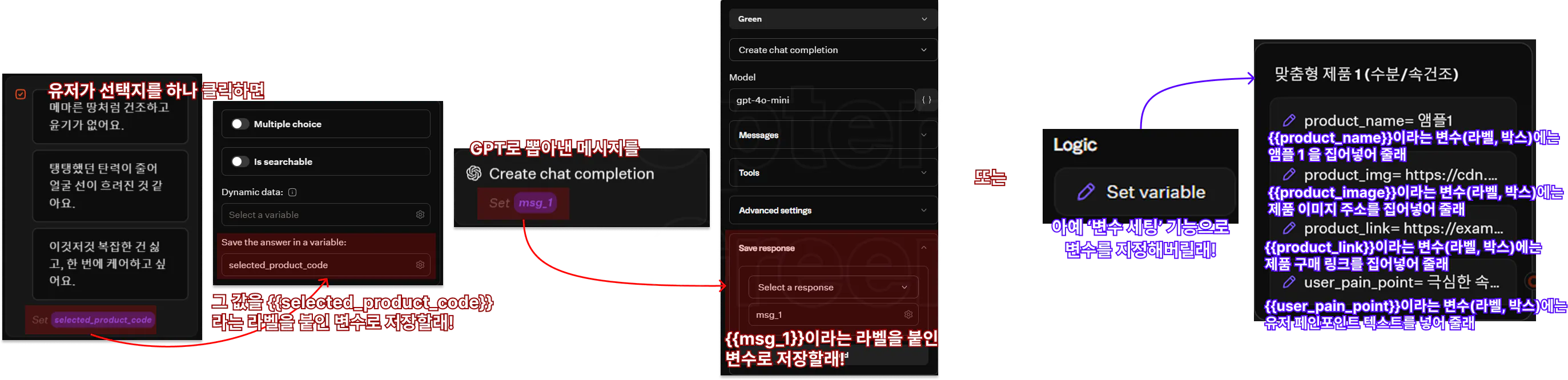 변수명에 제품명을 저장해두고 불러오게 한다던가, 링크를 저장해두고 리디렉션 기능에서 링크 변수를 호출해 내 제품 판매 사이트로 연결한다던가, 혹은 OpenAI API에 연결해둔 프롬프트에서 변수를 호출해서 변수로 불러와진 특정 제품에 대해 소개하도록 만든다던가...