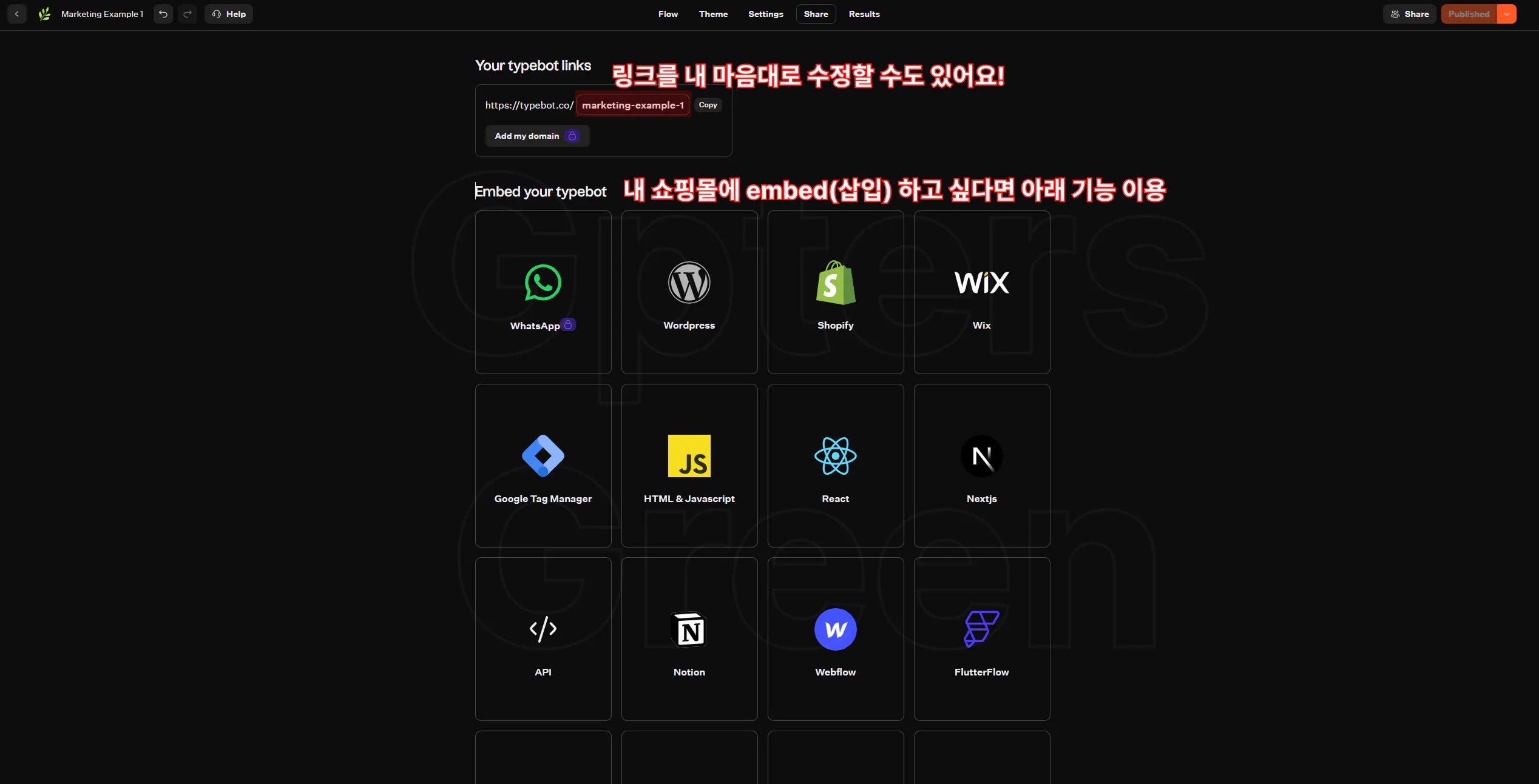 타입봇 상단에는 Flow / Theme / Settings / Share / (Result) 탭이 있는데요.
