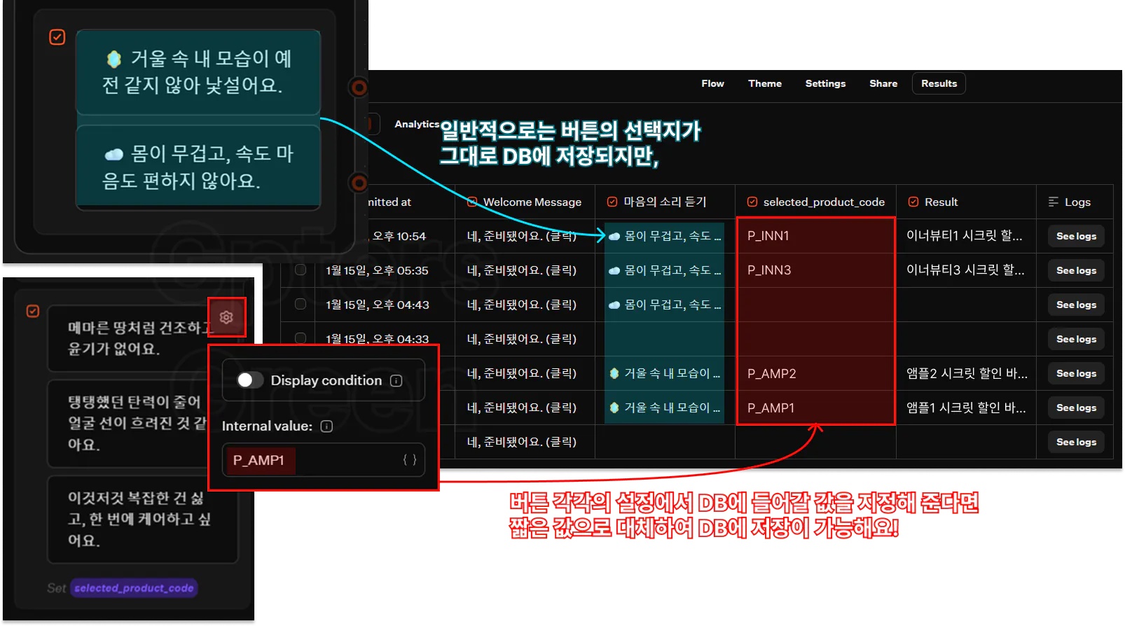 두 번째는 직접 변수를 설정해두는 방식인데요. 예를 들어 사용자가 A/B/C 선택지 중 하나를 선택하면, A를 선택할 때에는 이런 변수를, B를 선택할 때에는 이런 변수를, C를 선택할 때에는 이런 변수를 넣어야지... 하고 상황에 다른 값을 집어넣도록 세팅해두는 방식이에요. (이미지의 파란 글씨 부분을 살펴보세요!)
