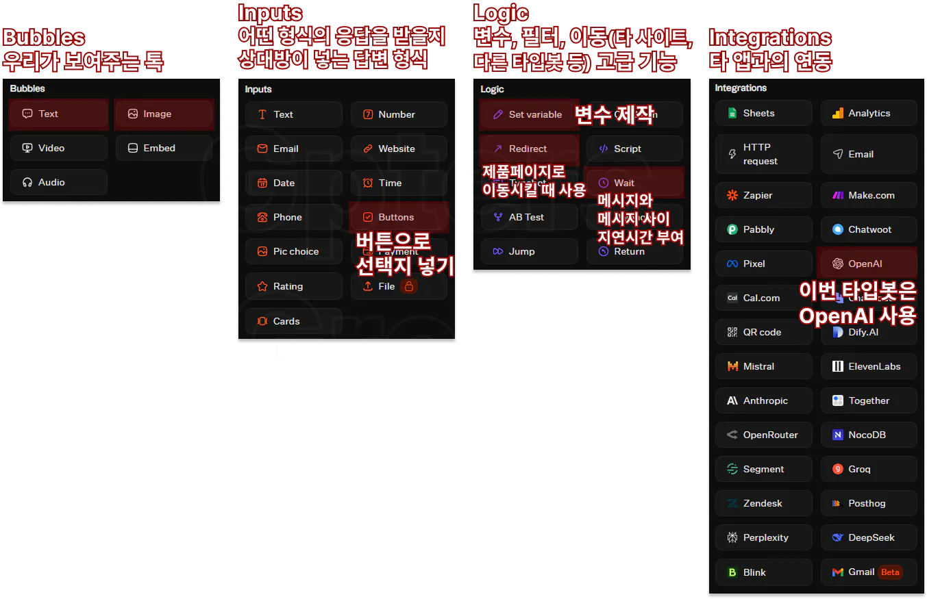 Typebot은 Scratch처럼 비개발자도 챗봇 플로우를 짤 수 있는 사이트인데요. 가입 후, 새로운 프로젝트를 만든 뒤, 왼쪽 네비게이션에 있는 박스들을 드래그 앤 드롭으로 끌고 와 플로우를 짜 주시면 됩니다.