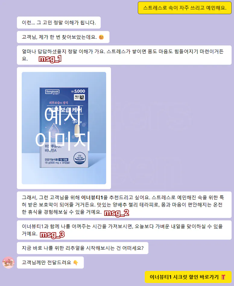 변수를 쓸 때: "**{{이름}}**님, 주문하신 {{상품명}}이 오늘 발송되었습니다." (윤그린님, 주문하신 앰플이 오늘 발송되었습니다.)