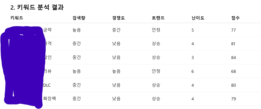 키워드 뽑아달라고 하면 알아서 여러 키워드들 점수 매겨줍니다.