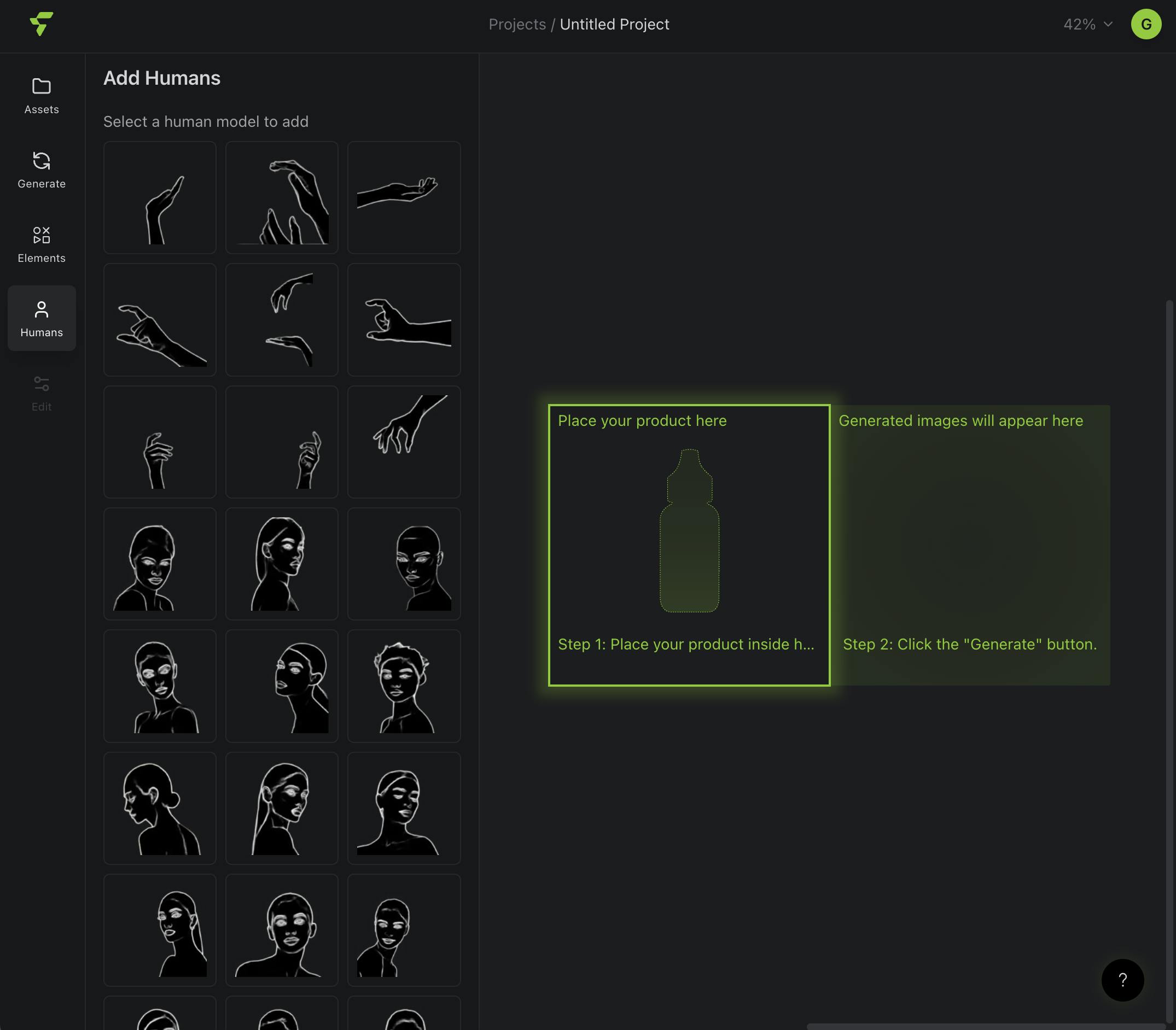 Generate 메뉴를 보면, 야외사진, 설정사진, 스튜디오 사진 등의 샘플이 나와 있는데