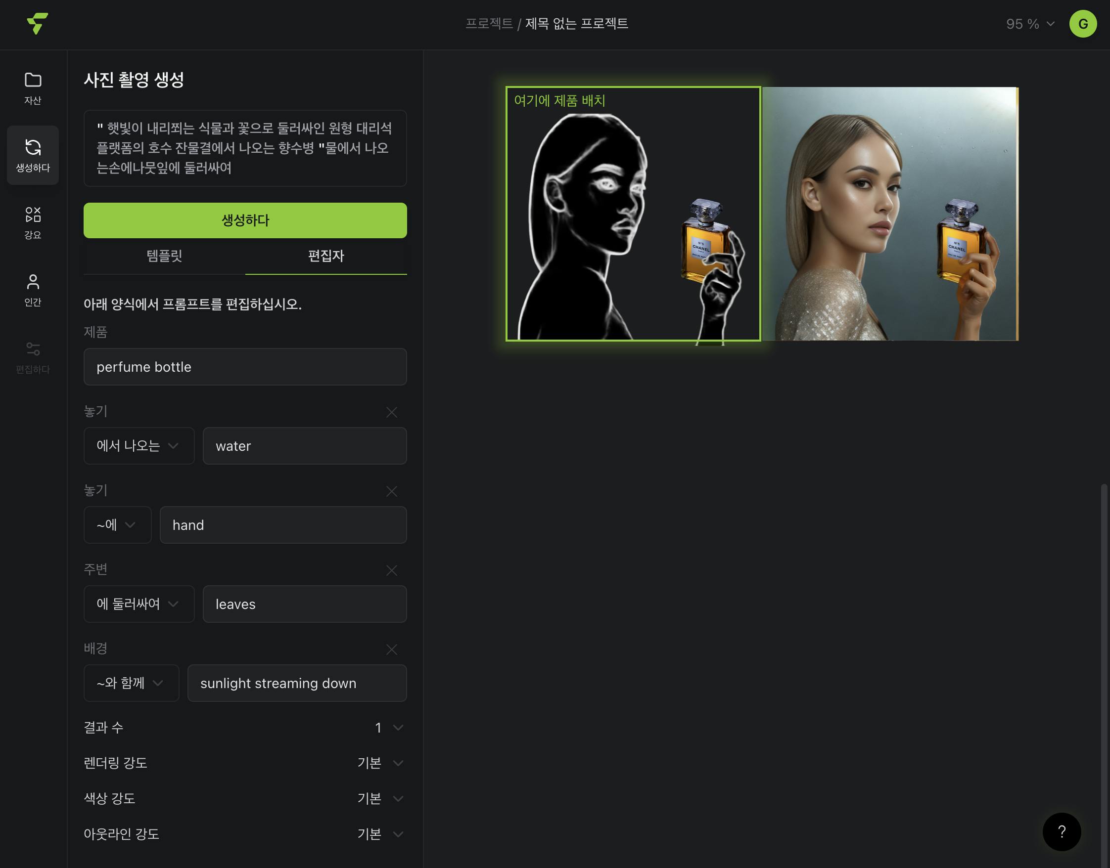 app.flair.ai 라는 사이트가 있는데 제품을 광고처럼 찍은 것 같은 느낌을 주는 사이트이고,