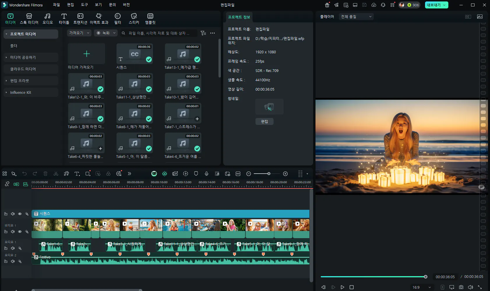• 필모라로 영상 + 목소리를 타임라인에 배치하고,