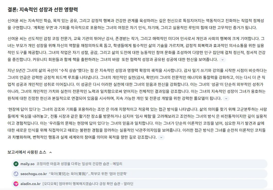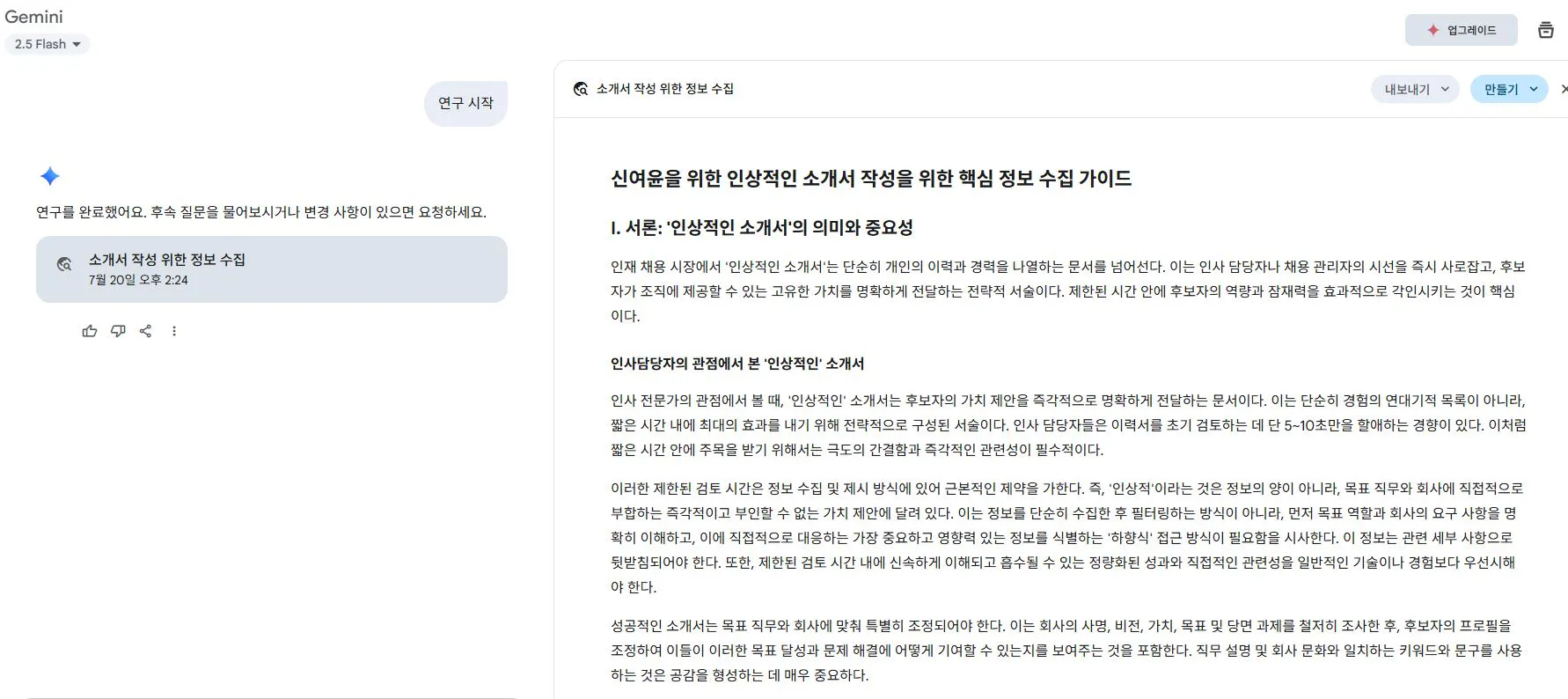 다양한 일을 해 오며, 객관화하는 소개서를 담담하게 준비하고 싶었고 제미나이를 통해 딥 리서치를 활용하여 나만의 원씽 스토리를 정리하고 싶었다.
