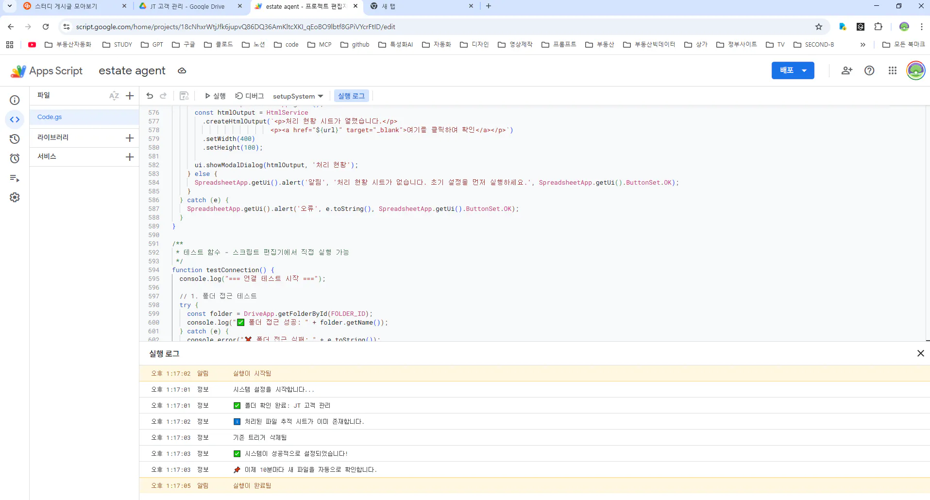 다시 수정해준 코드를 입력합니다. 정상 작동합니다. 10분마다 트리거를 설정해놔서 바로 문서가 작성이 안됩니다. 딴짓을 하고 옵니다.