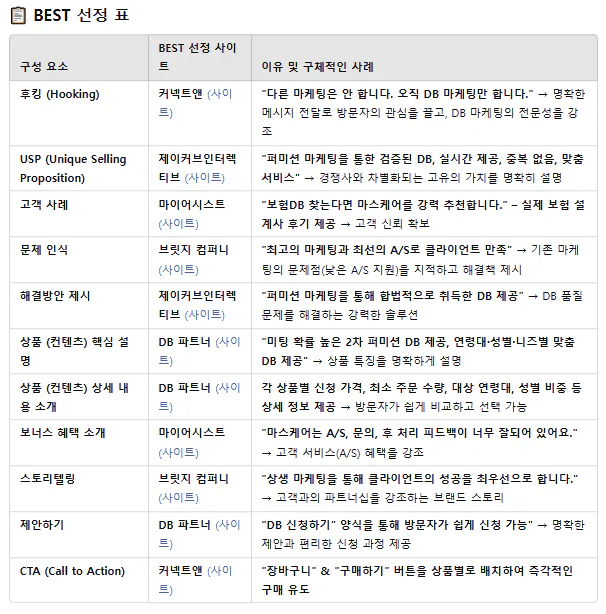 추가로 5개 사이트의 각 구성요소의 Best를 선정해주고, 각 요소별 Best 선정 사이트에 대한 구체적인 문구나 사례를 추가해서 알려줘.