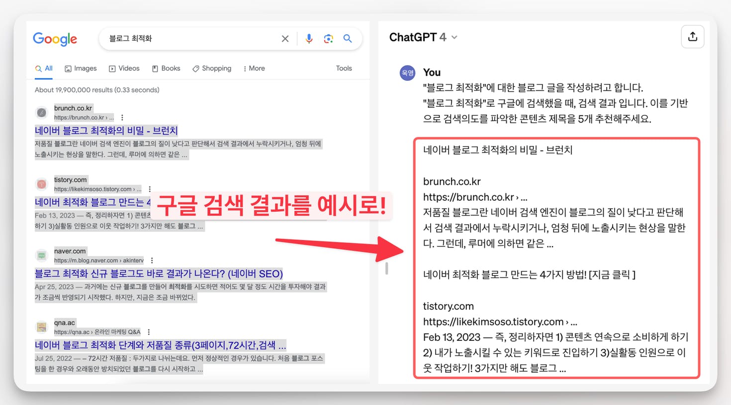 블로그 콘텐츠의 제목을 정할 때, 검색의도에 맞는 내용을 작성하는 것은 무엇보다 중요합니다. 챗GPT에게 검색의도에 맞는 게시글을 작성하라고 부탁할 때, 구글 검색 결과를 예시로 들면 더욱 좋습니다.
