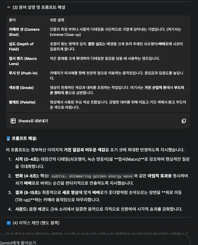3) 프롬프트를 만들다 보면 이것저것 바꾸고 싶은게 생기고, 영상을 만들다보면 조금 더 바꾸고 싶은게 생기고 하지요 이런 것들을 수정 요청하면서 프롬프트를 다듬어 보세요