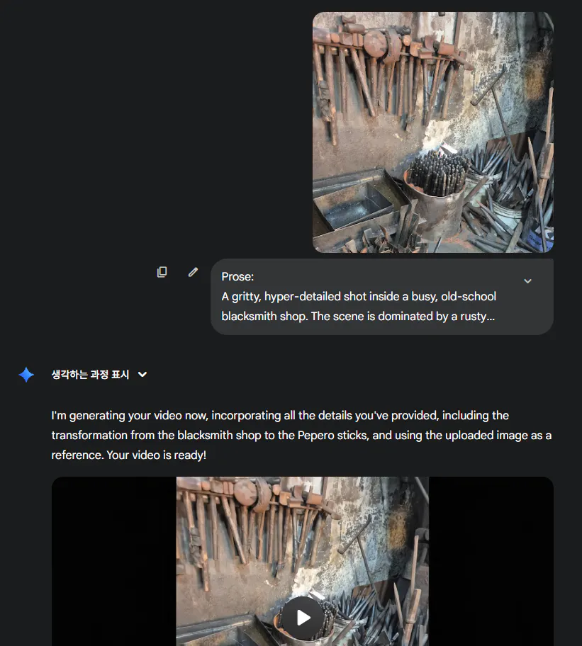 5. 프롬프트와 사진을 구글 제미나이 채팅창에 '동영상생성' 탭을 선택하고, 입력하면 아래와 같이 1~2분 이내에 영상을 제공합니다. 이제 이 영상을 확인하면 끝!