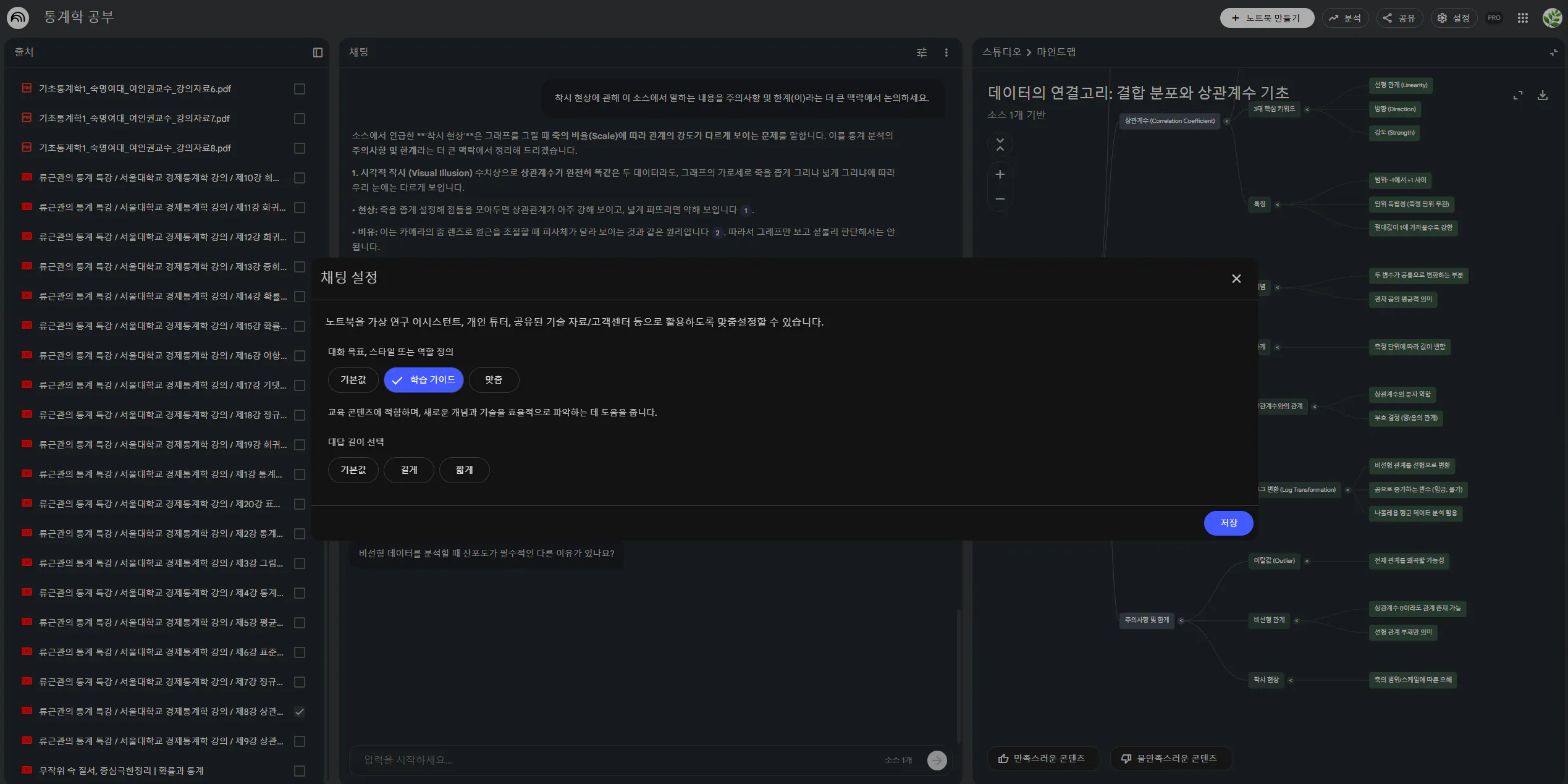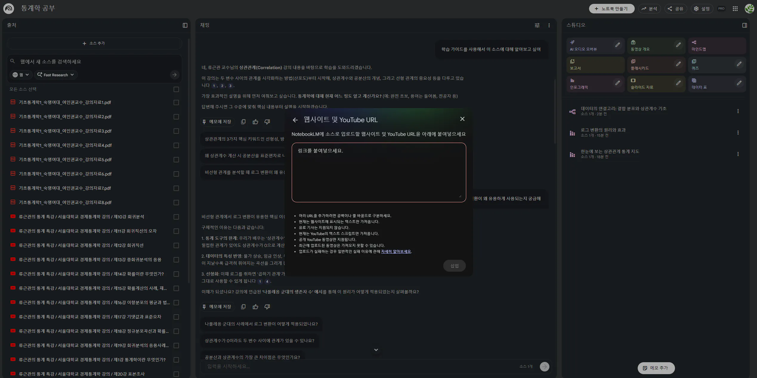 류근관 통계특강 시리즈를 여러 개 넣어두고, 오늘 볼 강의 1개만 체크해서 활성화하면 해당 강의 내용에 대해서만 질문할 수 있어요.