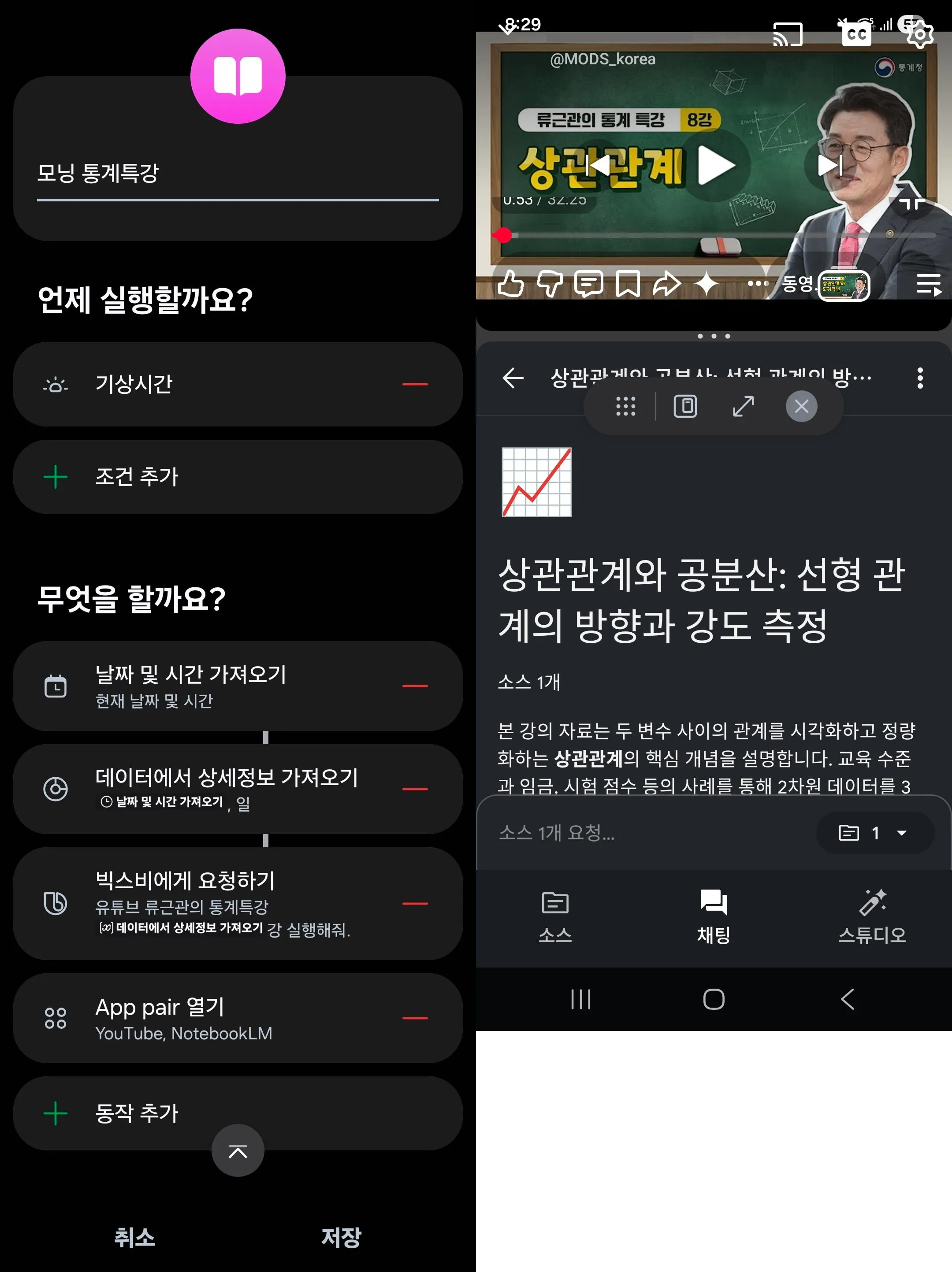 App pair(분할화면)으로 유튜브 + 노트북LM 자동 배치