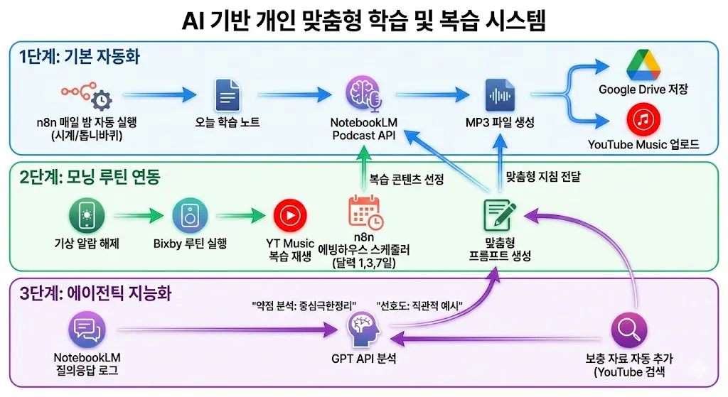 근데 문제는 팟캐스트 생성 자체가 수동이라는 거예요. 노트북LM에서 직접 Audio Overview 생성하고, 직접 다운받고, 직접 휴대폰에 넣어야 해요. 여기까지 자동화가 안 되니까 완전한 루틴을 만들기가 어렵더라고요.