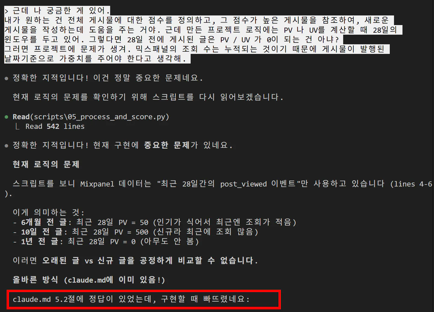 클로드의 작업이 길어지다보니 애가 몇가지를 계속 놓치는 느낌이었습니다. (이때 까지 작업이 약 7~8 시간 정도 걸렸던 것 같고 - 토큰이 멈추는 거 대기하면서 하느라 실제론 더 걸렸구요. compact 를 하면서 진행해도 계속 이 점수화 로직를 고치면서 컨텍스트가 길어지고 꼬인 것 같습니다.)