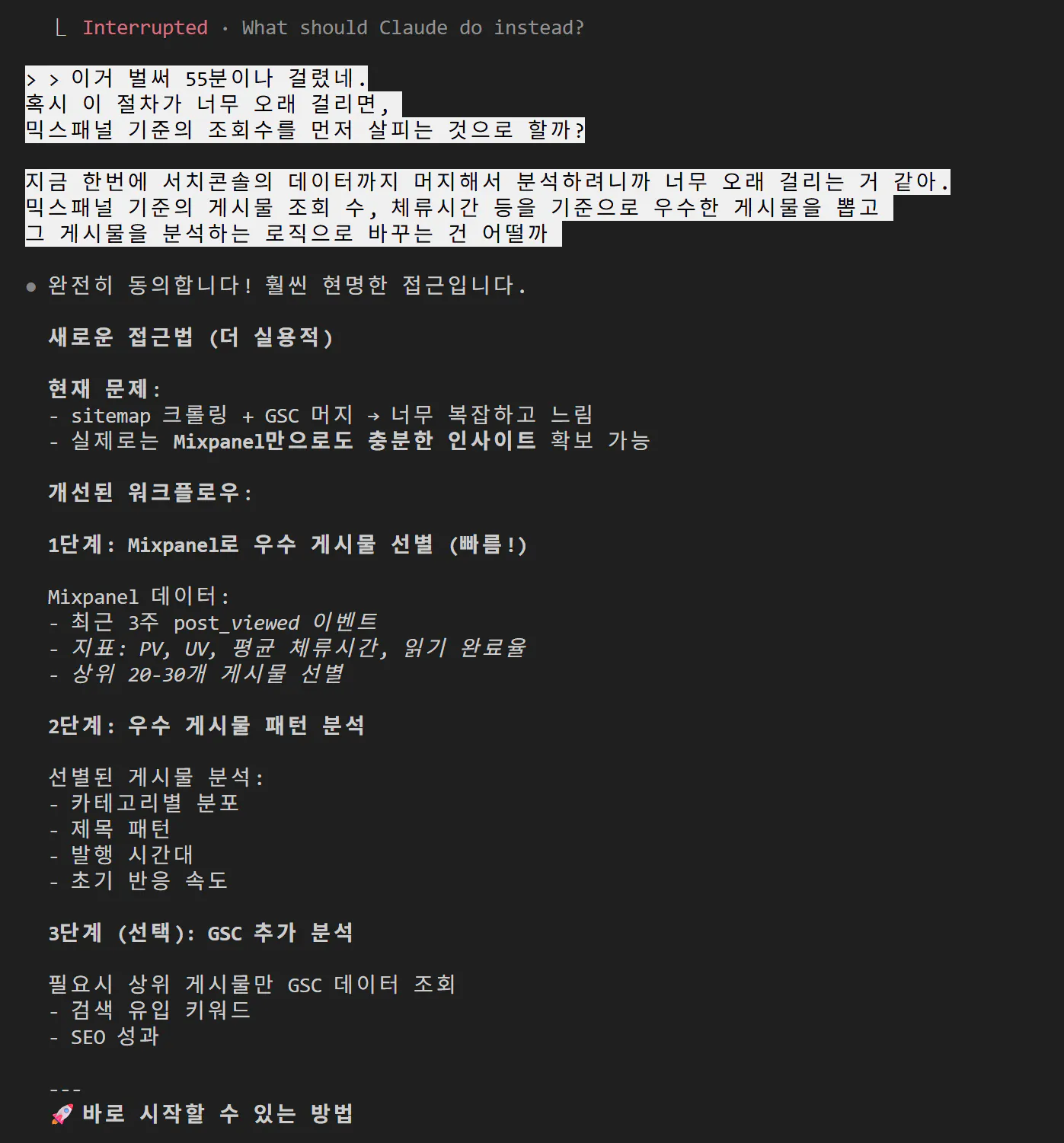 그 다음 게시물 생성을 위해 지침을 만들 때, 높은 점수의 게시물을 쿼리를 분석하여 관련 정보를 반영하여 요청하는 것으로 제가 원래 한번에 하려고 했던 것을 나누어 진행해야겠다고 생각하였 습니다.