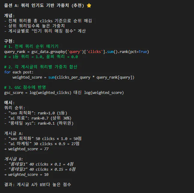 단순히 노출비치거나 클릭된 횟수만 보는 것이 아니라, 해당 쿼리의 ‘인기도’ 또한 함께 반영해야 한다고 판단했습니다.