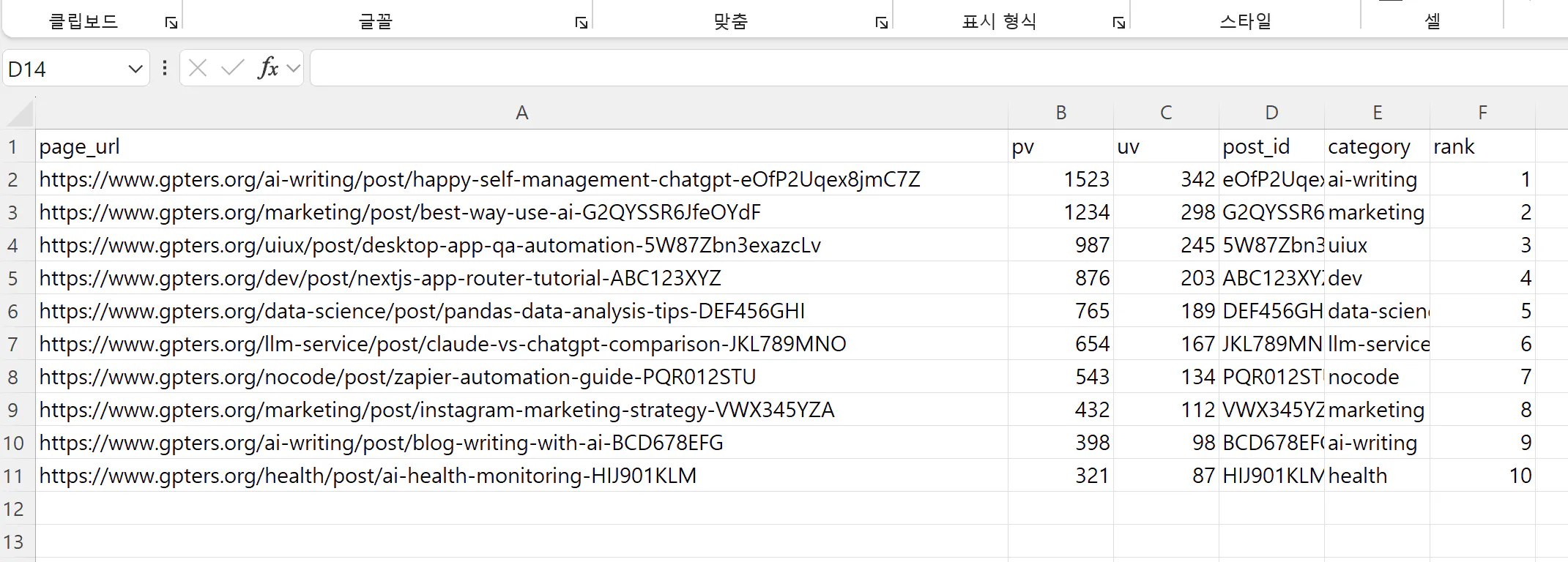 그런데 이렇게 보니 또 게시물읠 게시한 뒤 14일 동안의 조회 수가 아닌 진행 시점의 14일로 계산된 테이블을 주더라구요.