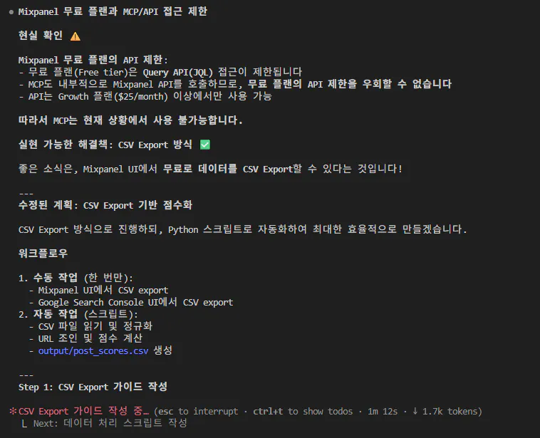 확인 결과, 당시에도 Claude가 무료 플랜이었으며, Mixpanel의 CSV Export 기능으로 데이터를 다운로드한 뒤 Python 스크립트를 통해 가공 및 활용하고 있었습니다.