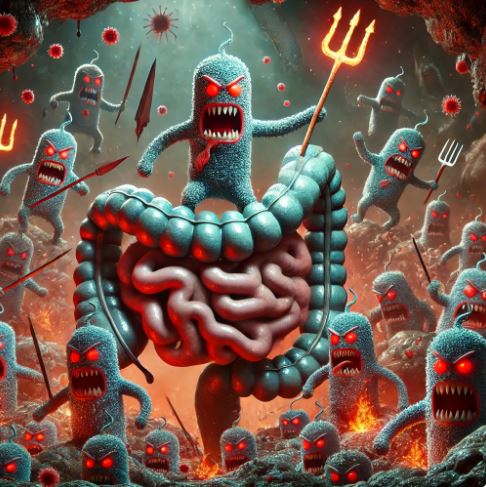 장내 나쁜 미생물이 창을 들고 난동을 부리는 모습을 지금 그림으로 그려줘.