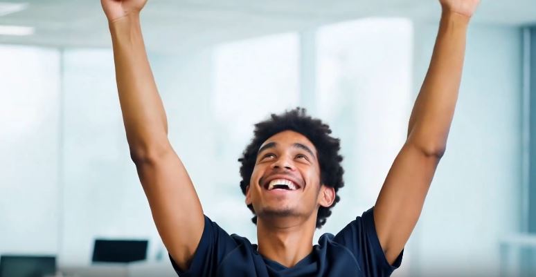 아래 내용을 미드저니에 프롬프트를 영어로 작성하고 해석해줘: 젊은 남자가 몸이 편안해져서 기뻐하며 만세를 부르는 모습