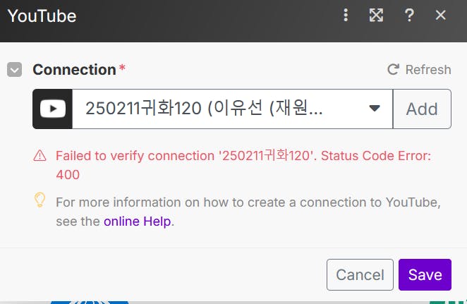완성된 메이크에서 다시 돌리면 항상 이런 오류가 나왔습니다. 유튜브 계정이 2개라서 그런가 생각이 들었지만 모든 아이디는 동일한데 유튜브의 메인 계정이 다른 구글 아이디라서 그런거 같습니다. 그 이유는 다른 유튜브 계정의 경우 메이크. 지피티, 레오나르도, 제이슨 계정과 같은 구글 아이디 여서 그런가 멈추지 않는 오류가 있었고 유튜브 메인 계정이 하필 메이크과 다른 구글 아이디 라서 그런거 같아 보이는데 잘은 모릅니다