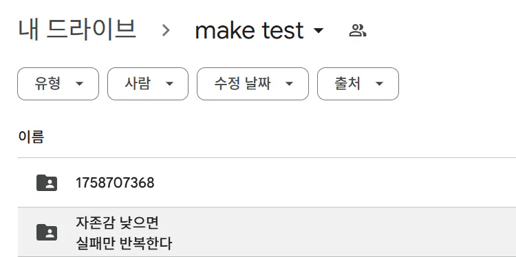 ๊ตฌ๊ธ ๋๋ผ์ด๋ธ์ ๊น๋ํ๊ฒ ์ ์ฅํ๋๋ก ํ์ผ ์ ๋ชฉ, ํด๋ ์ ๋ชฉ์ ์์ ํ๊ณ ํด๋์ ์ ์ฅ๋๊ฒ ํจ.