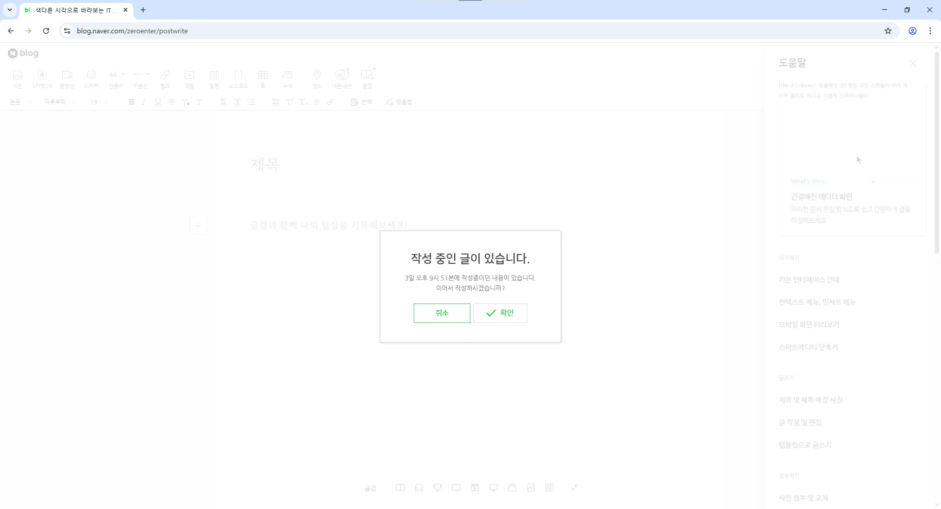 # "작성 중인 글이 있습니다" 팝업 처리