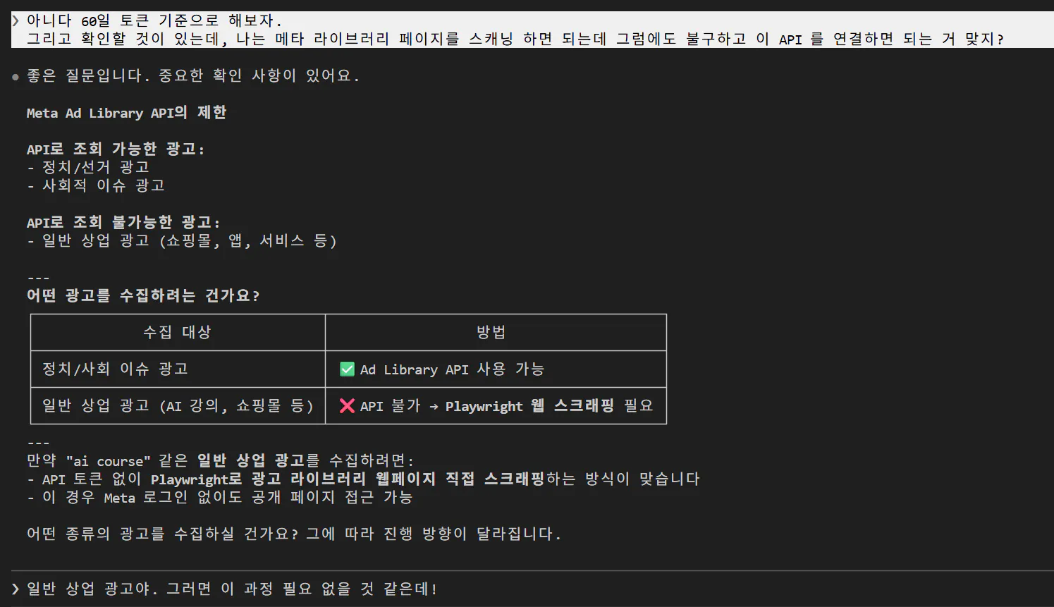 초기에는 메타 API 연동을 우선적으로 검토했으나, 실제로 확인한 결과 광고 라이브러리 API는 정치·사회 광고만을 대상으로 제공되고 있었습니다.