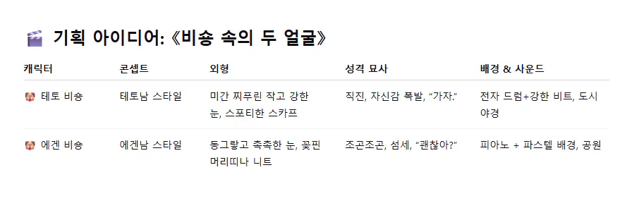 상황 설정도 중요했는데, 어떤 상황에서 이 두 캐릭터의 대비가 잘 드러날 수 있을지를 계속 GPT와 상의했어요. 여러 장면들 중에서 명확한 대비가 나타날 수 있는 장면 3개를 정했어요.