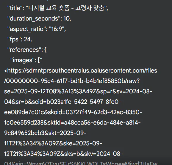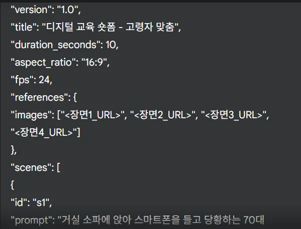 'JSON' 생성해서 영상을 만들기는 처음이다. 자연어로만 영상을 생성해보던 것을 JSON 하면서 수정할 수 있는 눈이 생겼다.