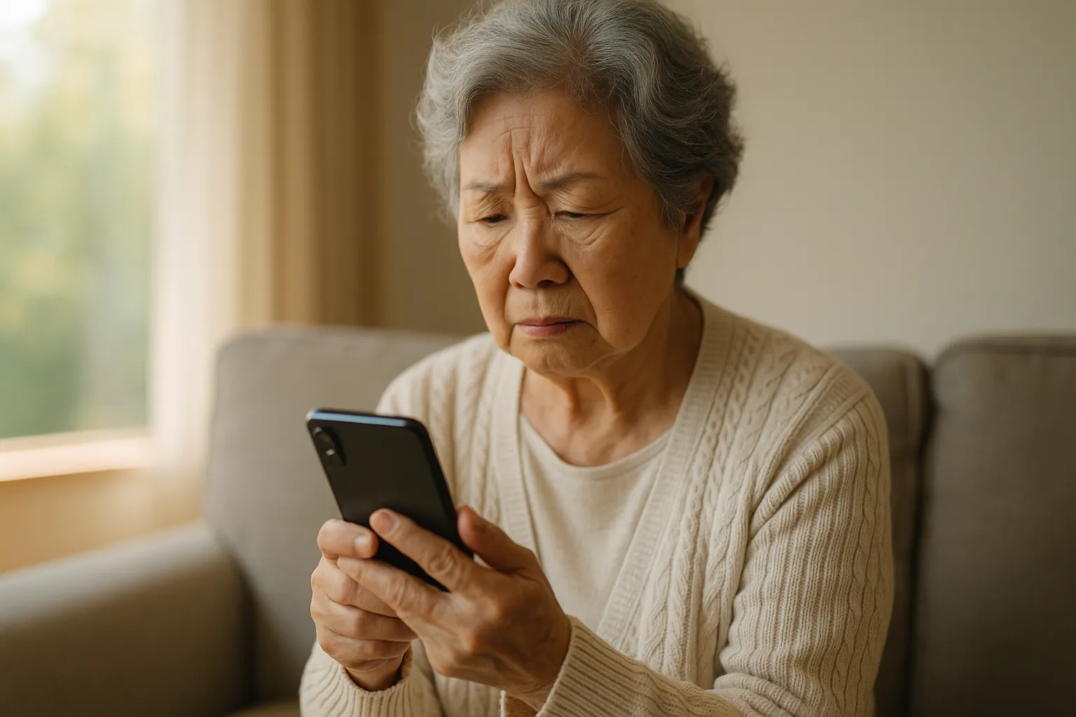 70대 한국 할머니가 집 거실 소파에 앉아 스마트폰을 들고, 앱을 찾지 못해 당황하는 모습.