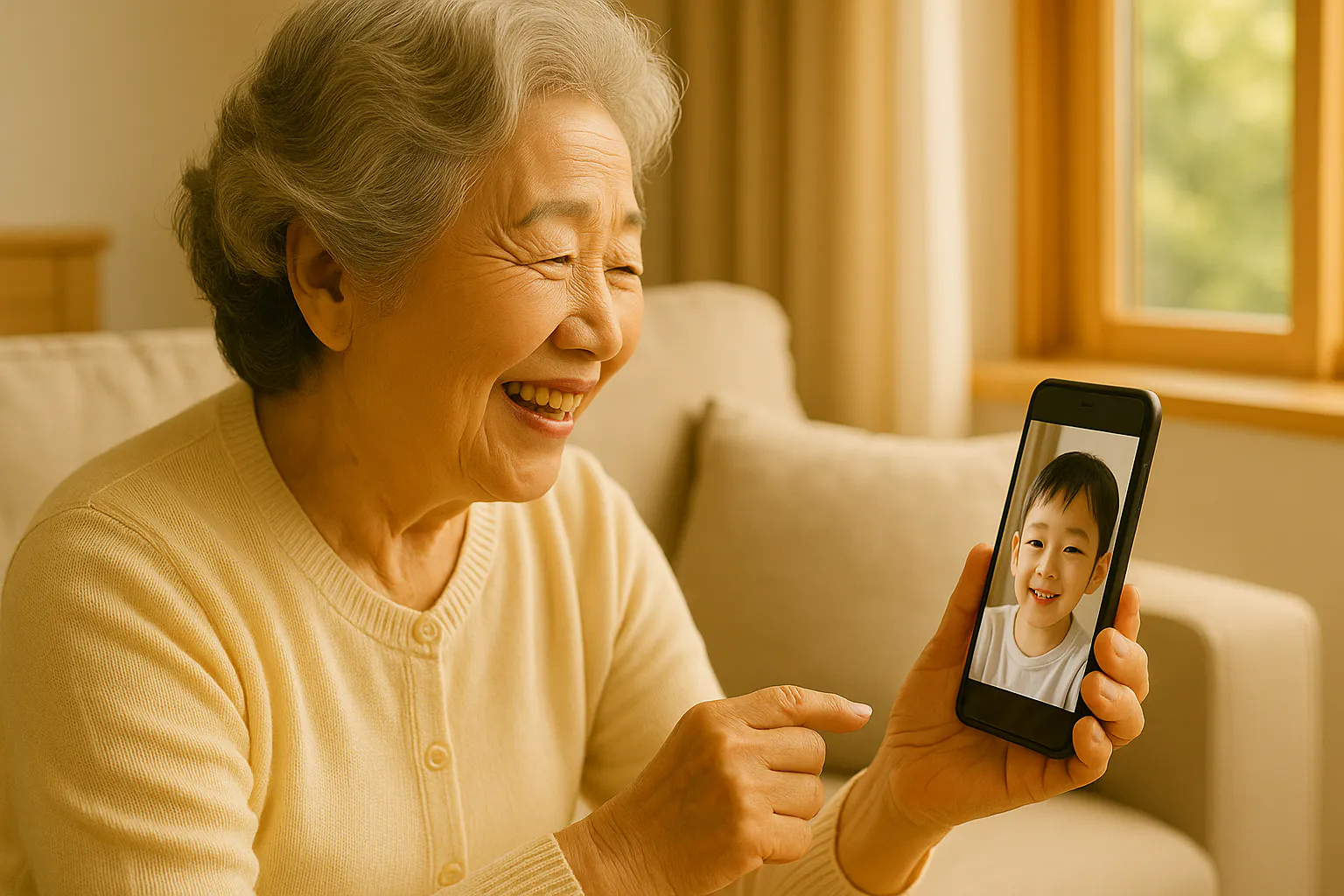 밝은 집 거실, 할머니가 스마트폰으로 손주와 영상통화를 하며 환하게 웃는 장면.