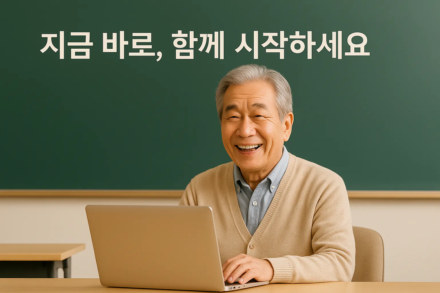 강의실 칠판 앞, 노트북을 편안하게 사용하는 70대 남성 수강생의 밝은 모습.