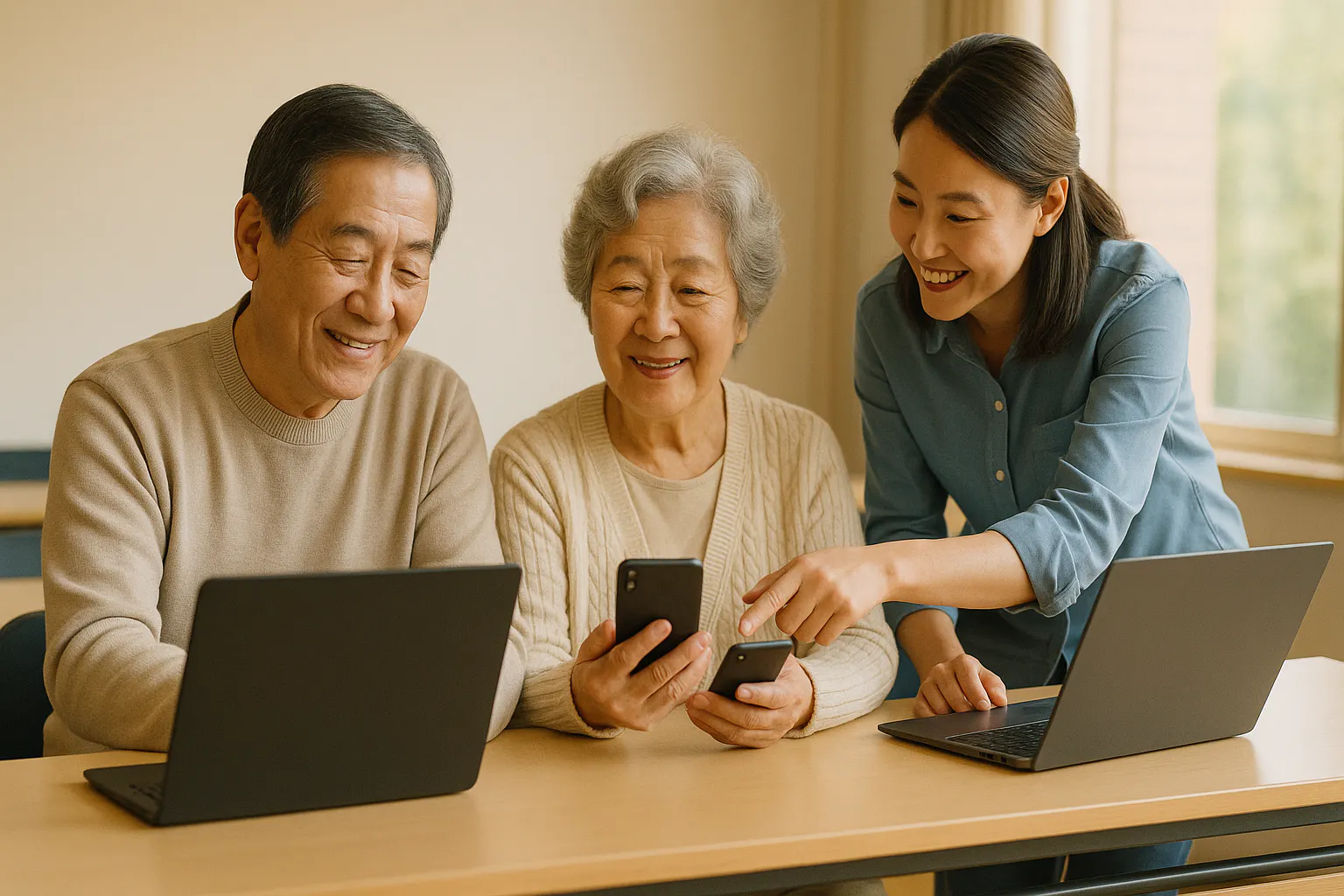 2인 1조 강의장의 책상에 앉은 70대 한국 남녀 수강생. 각자 노트북과 자신의 스마트폰을 가지고 있으며, 강사가 옆에서 친절하게 설명하는 장면.