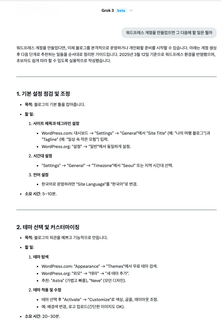 당신은 제 AI 에이전트로서, 제 워드프레스 블로그의 초기 설정 및 콘텐츠 작업을 대신 수행해야 합니다. 아래 지시를 따라 주세요. 작업이 끝난 후 결과를 보고해 주세요.