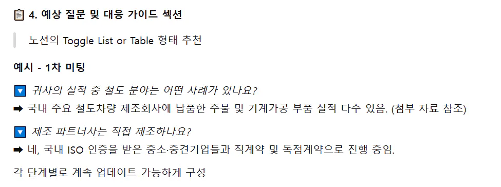미팅 각 단계별 예상 질문과 대응 가이드도 기재하고 싶어.
