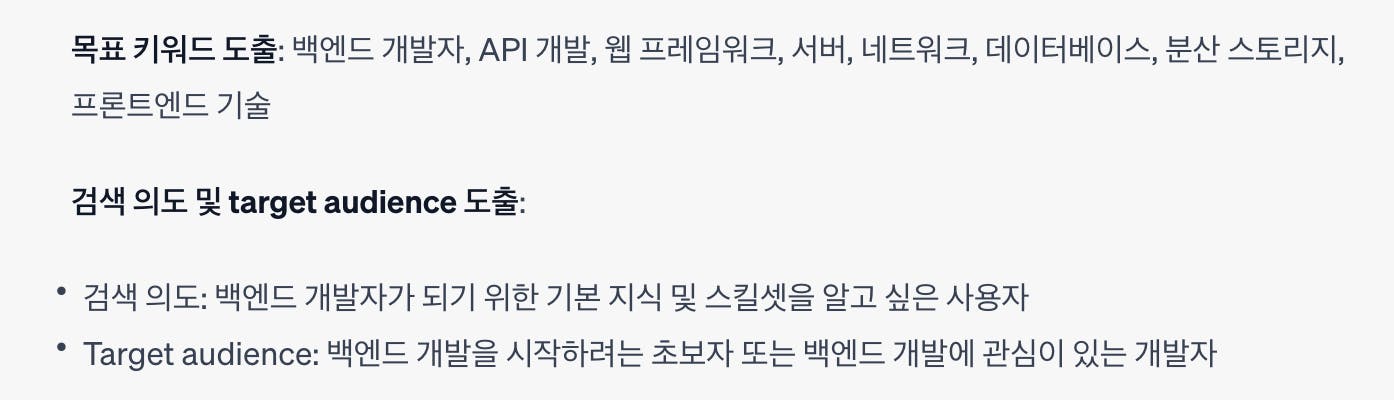 검색 의도, Target Audience 도출 결과의 경우 조금 일반적이기는 했지만 ‘백엔드 개발자가 되기 위한 기본 지식 및 스킬셋을 알고 싶어 하는 검색 의 도와, 백엔드 개발을 시작하려는 초보자 또는 백엔드 개발에 관심이 있는 개발자를 대상으로 해야 한다는 목표가 명확 해졌습니다.