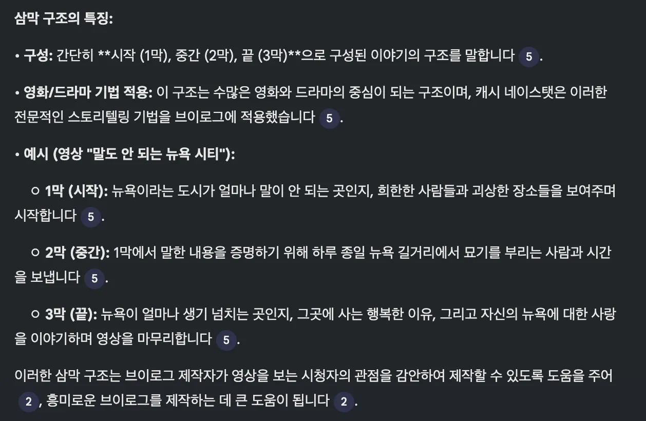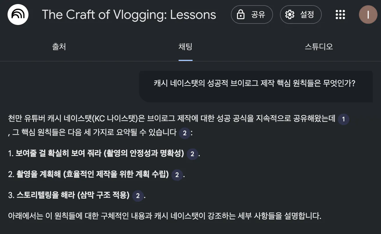 NotebookLM 덕분에 브이로그가 단순히 “찍고 나열하는 영상”이 아니라, 스토리텔링 구조를 갖춘 콘텐츠라는 점을 빠르게 이해할 수 있었습니다.
