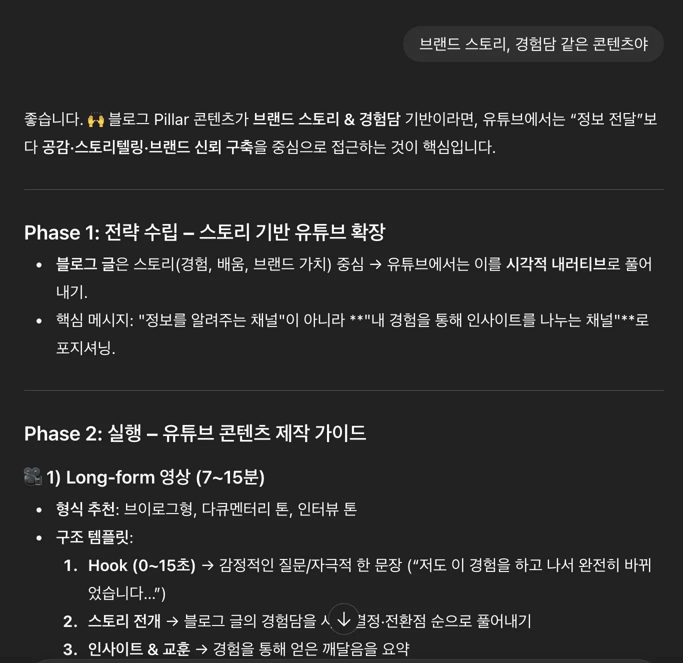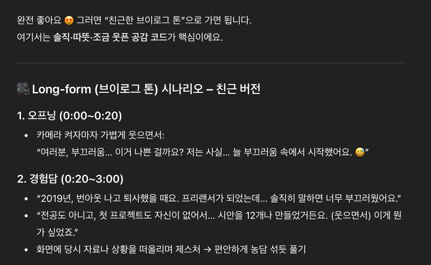 Long-form 시나리오 (7~12분): 오프닝 → 경험담 → 인사이트 정리 → 마무리