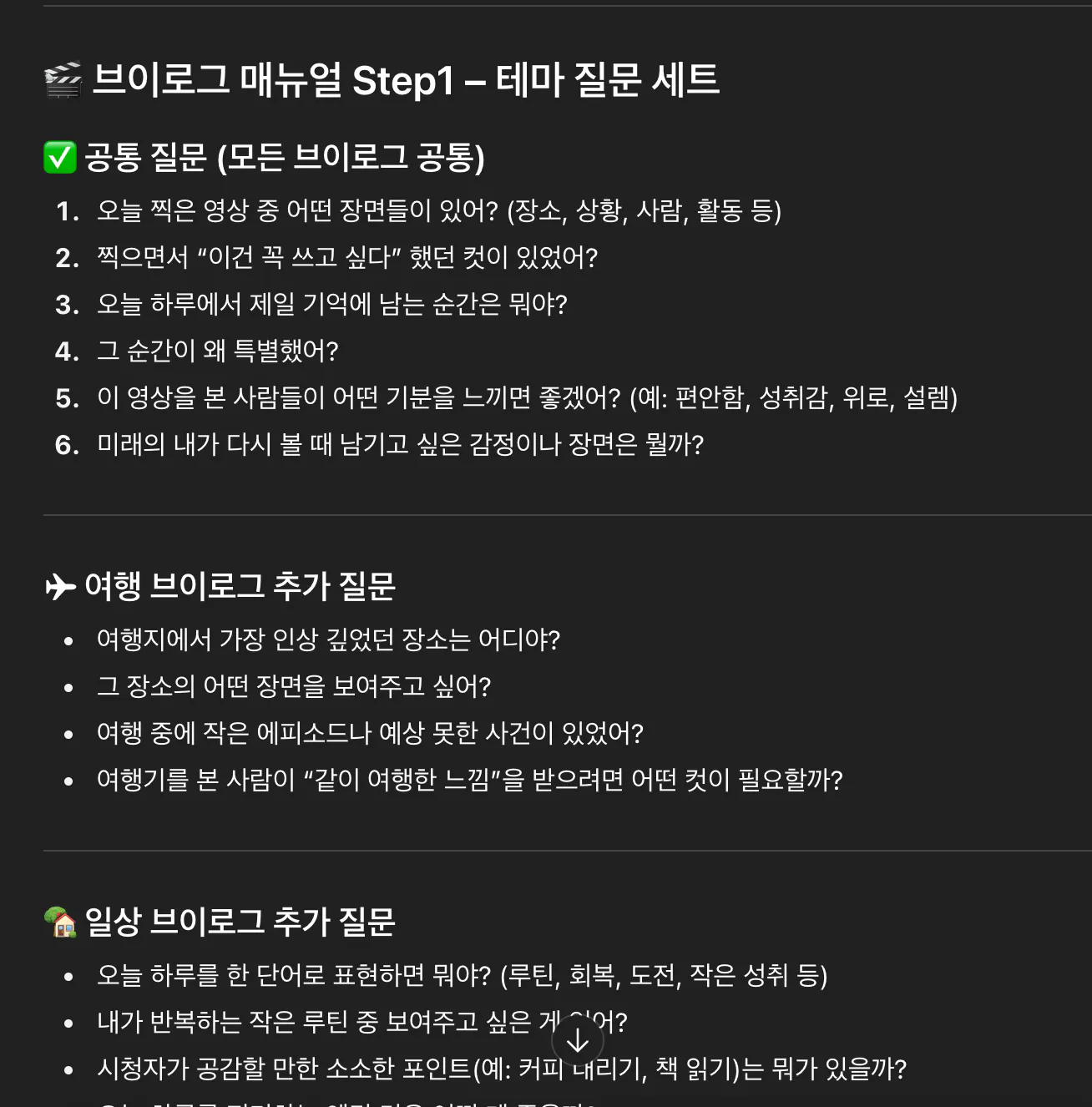 이 과정을 바탕으로, 저만의 브이로그 글쓰기/영상화 지침도 따로 만들어봤습니다.